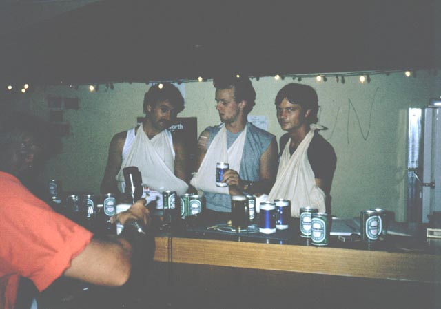 In true seismic style certain members of the crew came to the hospital (conveniently located next to the accident and just round the corner from the staff house) and held a vigil, complete with carrier bag full of beer. Shown left is Sandy Ritchie and John Metzger and right, Dave Jones and Sandy (both looking ever-so worried).